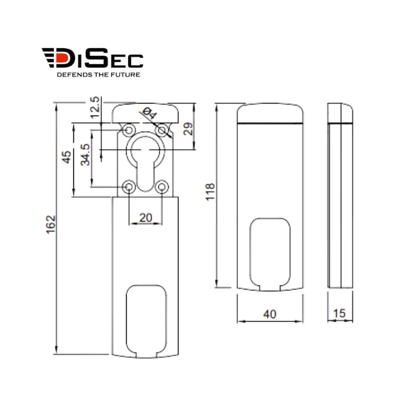 Escudo magnético MG110 DISEC de alta seguridad de perfil estrecho de 40 mm x 110 mm y grueso 15mm . Con seguridad antivandálica para la protección del cilindro o bombín y la cerradura.
